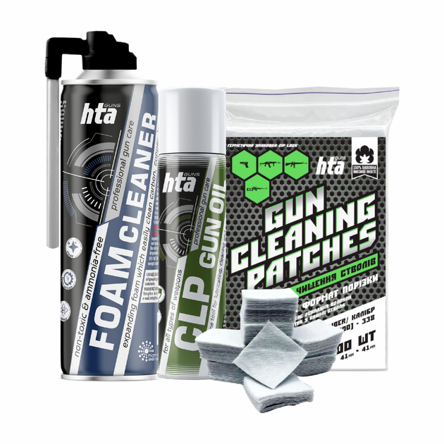 Набір для чистки та догляду за зброєю HTA: Піна для чистки зброї 500 мл + Патчі бавовняні 30 калібр під 7.62 для чищення збр