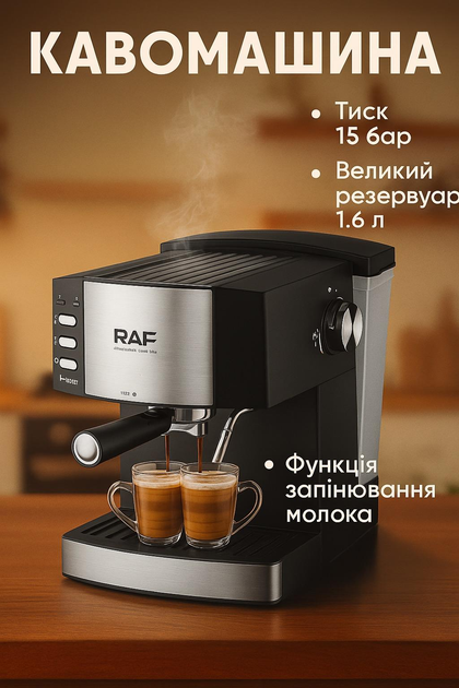 Кавоварка напівавтоматична RAF R.113 з капучинатором, тиском 15 бар, резервуаром 1.6 л, 850 Вт, сталева, для еспресо та капу