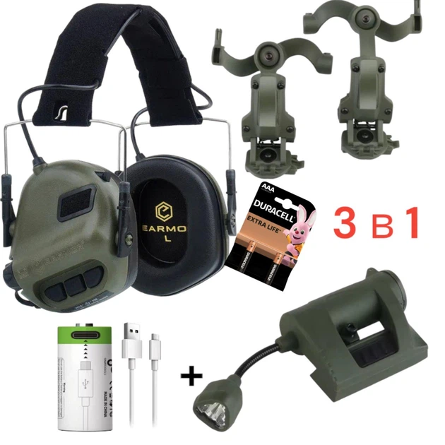 Тактичні військові навушники Earmor M31 з кріпленням чебурашки на військовий шолом + ліхтар на каску олива