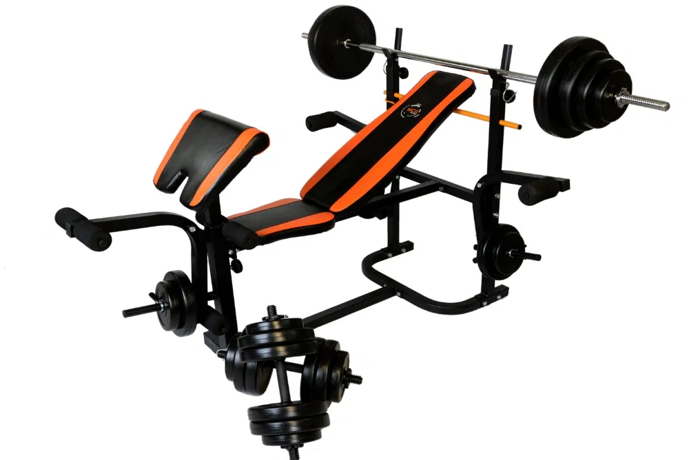 uo;, блок для тренування ніг і регульовану парту Скотта. У цьому комплекті також представлений розширений набір вагою 148 кг: штанга,