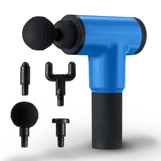 Вібраційний масажер для тіла Fascial Gun синій з акумулятором 4 насадки 6 режимів 24х24,5х51 см