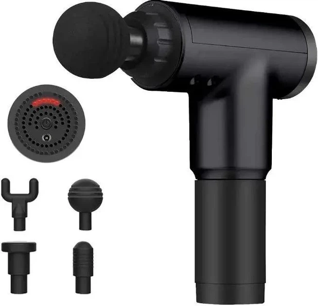 Вібраційний портативний масажер для тіла Fascial Gun чорний 6 режимів 4 насадки 24х24,5х51 см