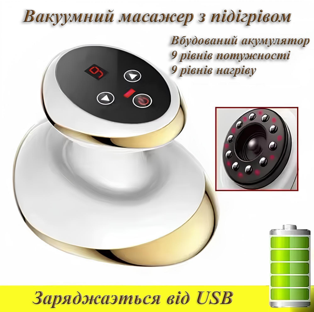 Вакуумний антицелюлітний масажер з дисплеєм, ІЧ нагрівання, 9 режимів, для схуднення, акумулятор 1200 мАг USB 5 Вт, білий