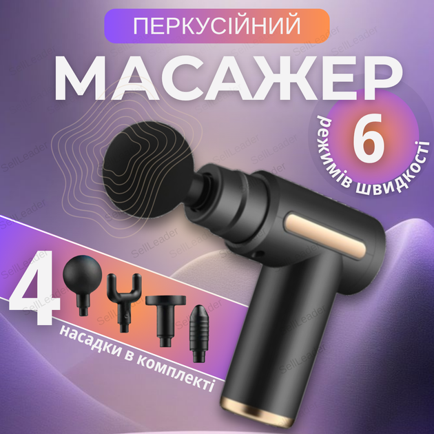 Масажер пістолет акумуляторний перкусійний 6 швидкостей для м'язів 4 насадки тихий
