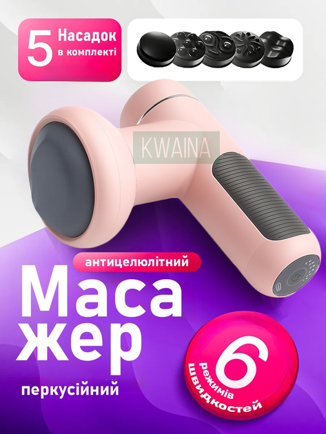 Масажер електричний антицелюлітний для ніг, шиї та спини ручний + 5 насадок, вібромасажер від USB, Рожевий
