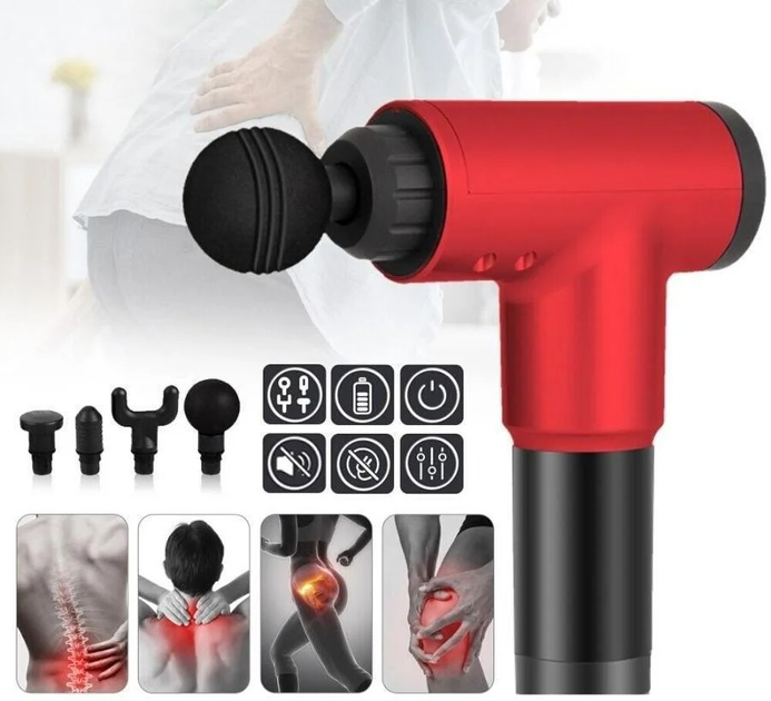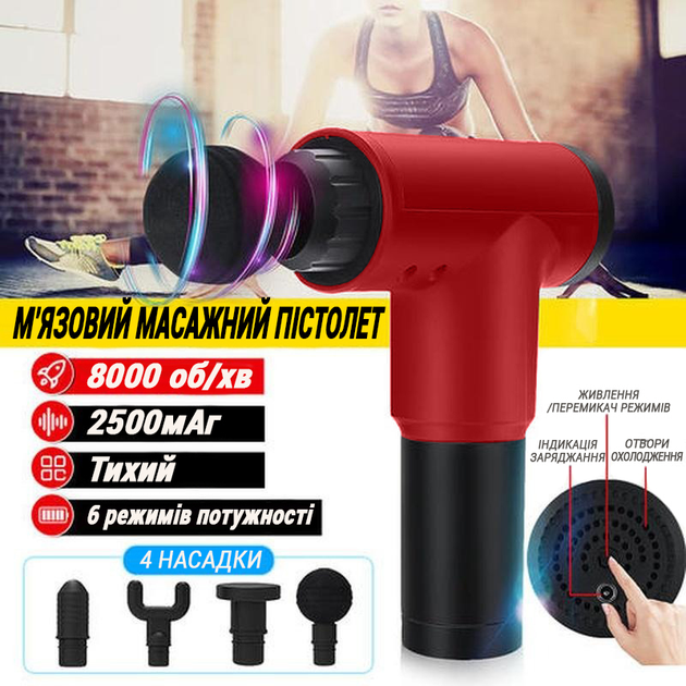 Акумуляторний масажер для тіла м'язовий портативний ручний пістолет 4 насадки Fascial Gun 4 насадки 6 швидкостей Red