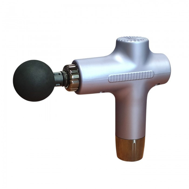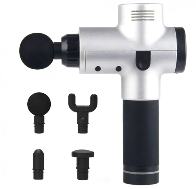 Акумуляторний масажер для тіла м'язовий портативний ручний пістолет 4 насадки Fascial Gun 4 насадки 6 швидкостей silver