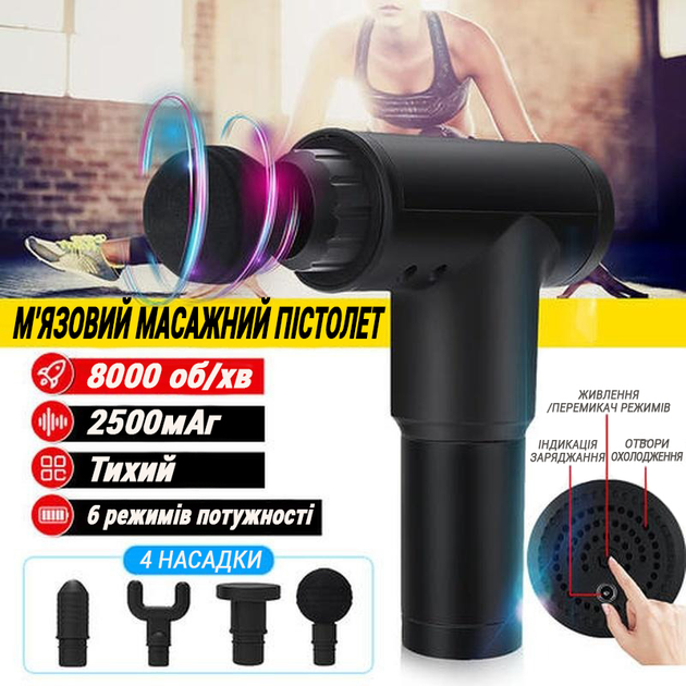 Акумуляторний масажер для тіла м'язовий портативний ручний пістолет 4 насадки Fascial Gun 4 насадки 6 швидкостей Black