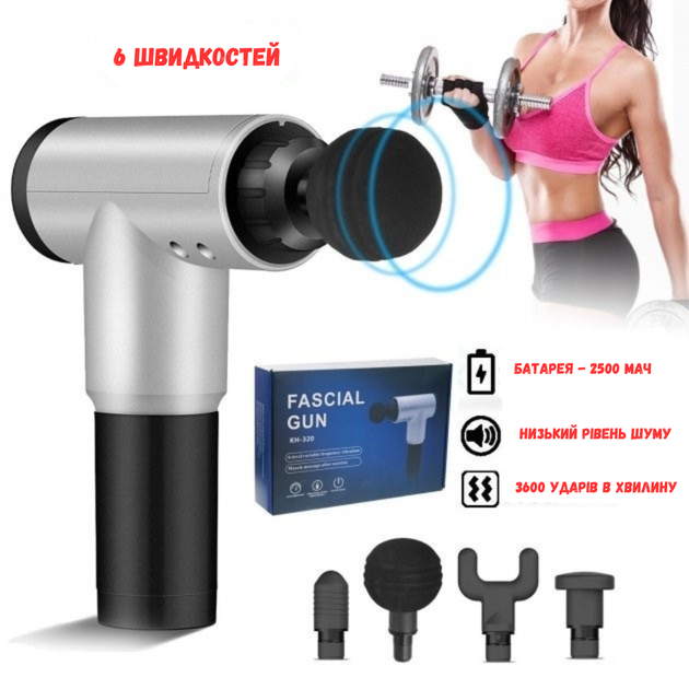 Акумуляторний масажер Fascial Gun KH-320 портативний ручний ударний м'язовий пістолет 4 насадки