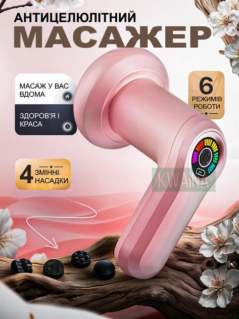 Масажер антицелюлітний акумуляторний вібромасажер для м'язів тіла 4 насадки 6 швидкостей рожевий