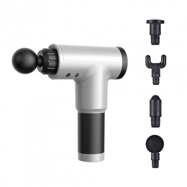 Ручний м'язовий акумуляторний масажер Fascial Gum масажний пістолет для всього тіла 4 насадки колір сріблясто-чорний