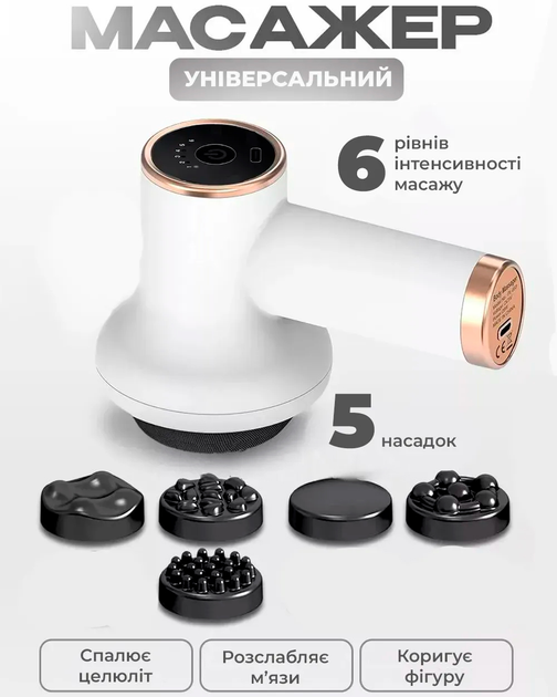 Масажер антицелюлітний акумуляторний для м'язів тіла рук та ніг 5 насадок 6 швидкостей Deep Rolling Massager Білий