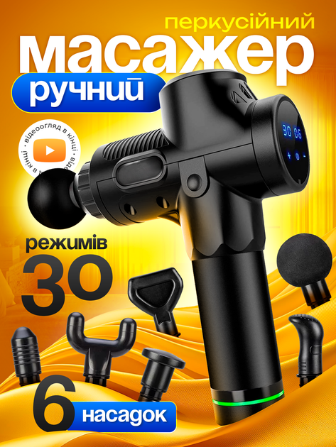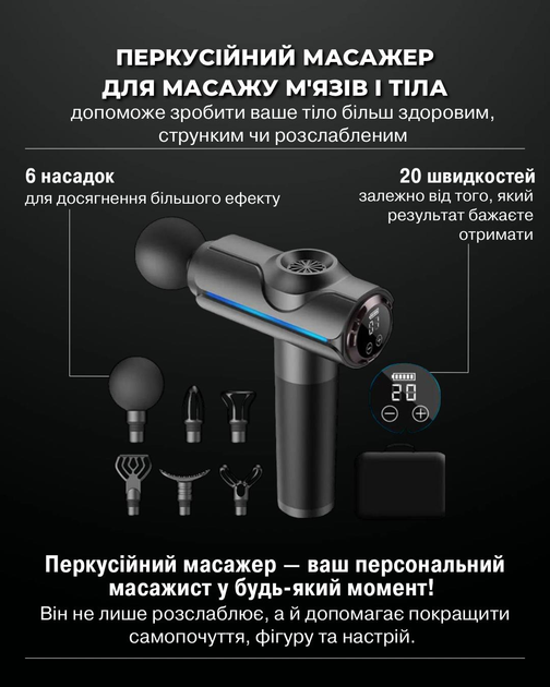 Перкусійний масажер для м'язів і тіла – масажний пістолет, 20 швидкостей, 6 насадок, портативний, чорний