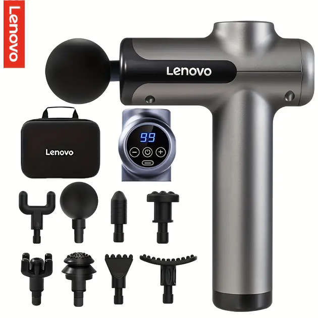 Перкусійний масажер-пістолет із 8 насадками Lenovo Grey з кейсом