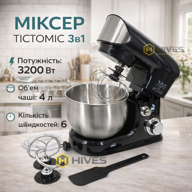 Кухонний планетарний міксер тістоміс з чашею на 4л з трьома насадками та потужністю 1500Вт Domotec 368S