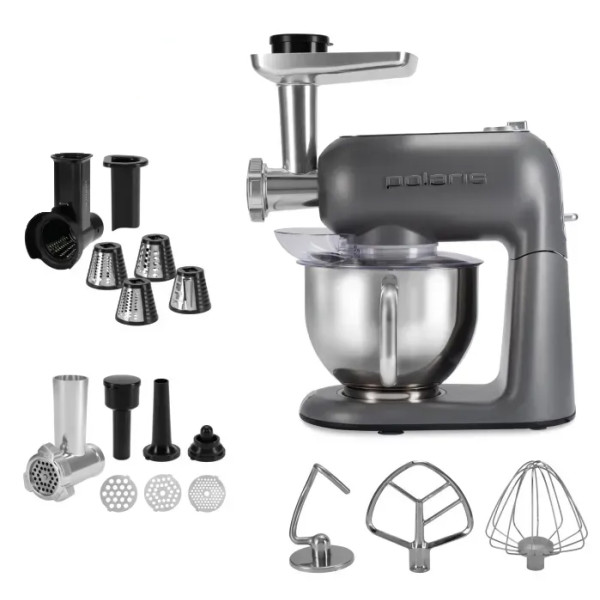 Тип - кухонний комбайн, потужність - 2300 Вт, об'єм основної чаші - 5.5 л, об'єм чаші блендера - відсутня, функції - змішування, збивання, замішування тіста, м'ясорубка, тертка, габарити - 38 х 38 х 28 см, Колір - сірий