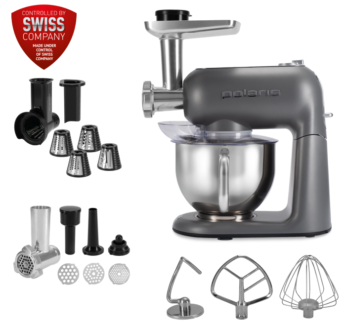 Виробник - POLARIS;Потужність двигуна - > 1500 Вт;Потужність - 2300;Кількість швидкостей - 6;Об'єм чаші - 4.1-6;Матеріал корпусу - метал;Матеріал чаші - метал;У комплекті - вінчик, гак для тіста, м'ясорубка, соковижималка, терка шинковка;Особливості - захист двигуна від перевантаження;Імпул