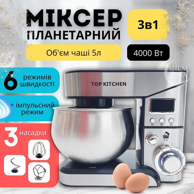 Міксер планетарний 4000 Вт з чашею 5 л Top Kitchen, потужний міксер-тістоміс з нержавіючої сталі, з LED-дисплеєм, 3 насадкам