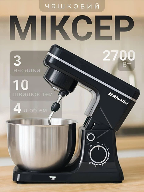 Планетарний міксер Riwall Pro з нержавіючою чашею 4 л — тістоміс електричний для кухні випічки кремів і тіста стаціонарний м