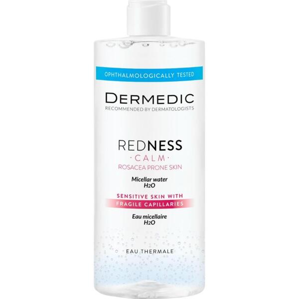 Dermedic Redness Calm Micellar Water H2O Sensitive Skin — міцелярна вода для чутливої шкіри, схильної до акне та куперозу. Засіб ефективно видаляє всі види забруднень, включаючи косметику, при цьому усуває подразнення та запалення, пом'якшує шкіру та підсилює природний захисний бар'єр. Завдяки збалансованій формулі, збагаченій корисними мінералами, воно зміцнює капіляри, тим самим протидіє розвитку куперозу. Особливості: Термальна вода — зміцнює судини, підтримує гідроліпідний баланс. Екстракт меліси лікарської — заспокоює, знімає почервоніння і набряклість. Гель алое — зволожує, очищає, має протизапальну дію. Очищальний засіб не залишає після себе жирної плівки, тільки приємне відчуття свіжості. Вода гіпоалергенна, безпечна для очей, пройшла клінічне тестування.