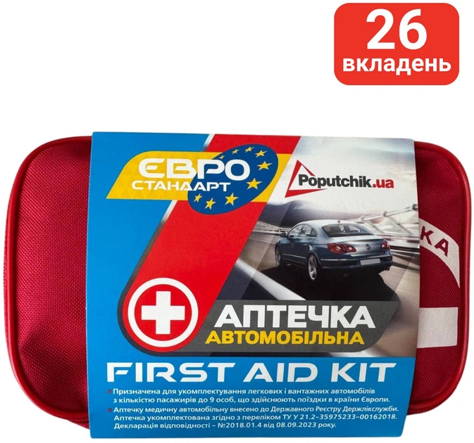 Аптечка медична автомобільна Poputchik Євростандарт згідно ТУ First Aid Kit м'який футляр (02-005-М)