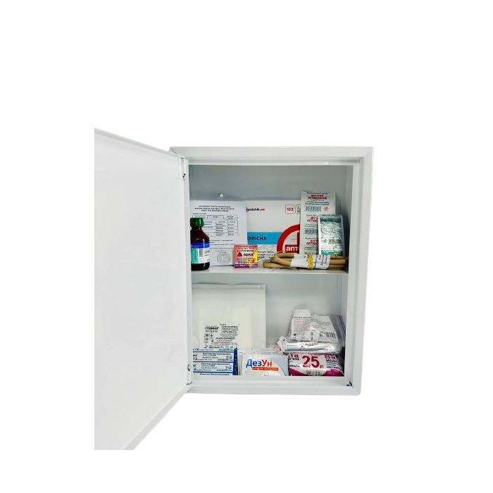 Аптечка містить вироби для обробки та перев'язки ран, антисептичні, дезінфекційні, протиопікові засоби, які стануть у пригоді в разі різного роду незначних травм. Металевий кейс для медикаментів можна розмістити в зручному доступному місці прикріпивши до стіни в цеху, на виробництві, на складі. Довідник з надання першої допомоги та рекомендації щодо застосування вкладень допоможуть вам швидко й ефективно використовувати медичний виріб за призначенням. Залежно від напрямку діяльності виробництва та видів травм — рекомендується доукомплектовуватися додатковими засобами першої допомоги.