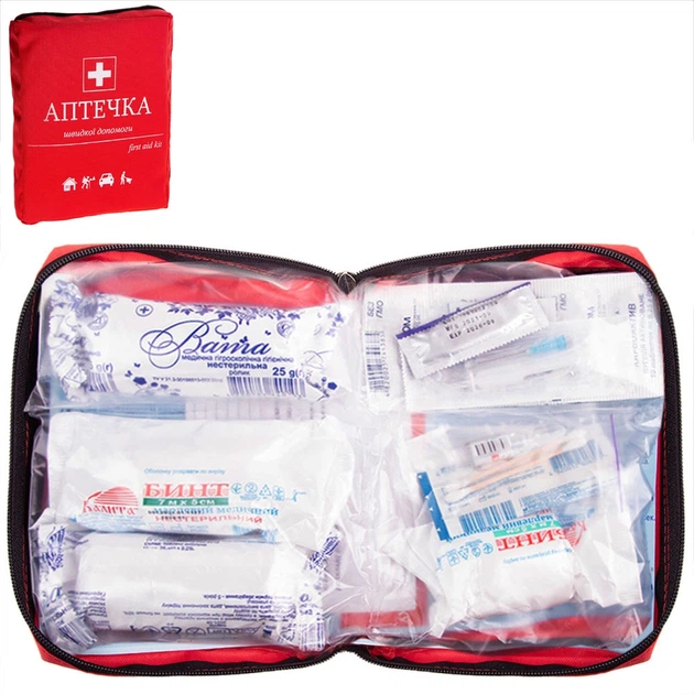 Аптечка медична автомобiльна 07-271-А 16од. 21шт червоний м'який футляр