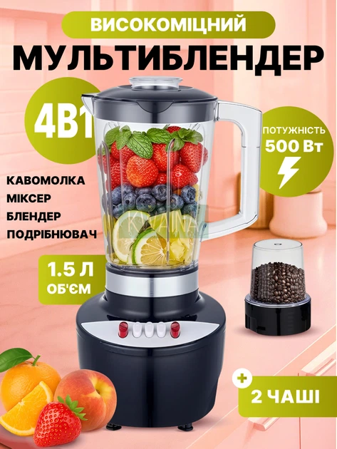 Професійний блендер стаціонарний 500W, 1,5л, +2 чаші, Блендер з чашею, подрібнювачем, 3 швидкісні режими, захист від перегрі