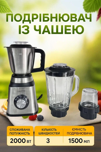 Блендер Z.e.p line ZP-069 3в1: стаціонарний + м’ясорубка + кофемолка, 2000 Вт, скляна ємність