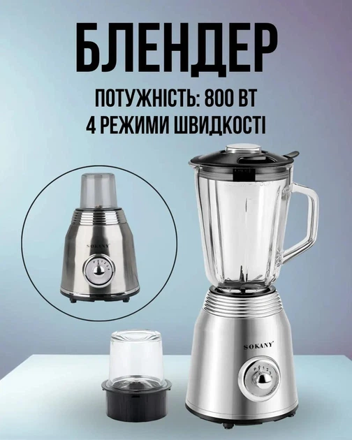 Блендер Sokany со стеклянной чашей 1,5 л для коктейлей и смузи, Мощность 800 Вт, 4 режима скорости, Портативный стационарный