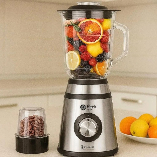 Блендер стаціонарний Bitek 2в1 з чашею кухонний подрібнювач з імпульсним турбо-режимом мульти-чаша нержавіюча сталь 2800 Вт