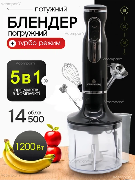 Блендер Занурювальний 3в1 Crownberg 1200 Вт 3в1 Міксер, Подрібнювач Блендер стакан, блендер для смузі Black