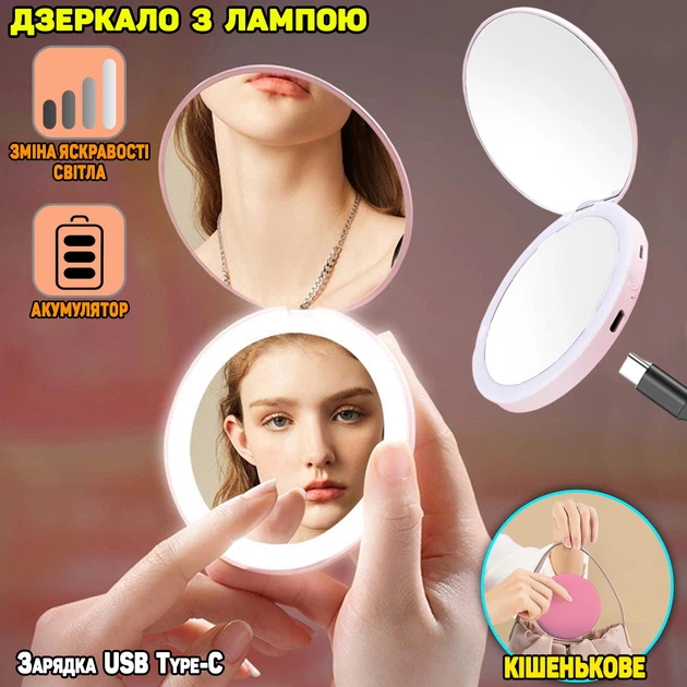 Кишенькове дзеркало з підсвічуванням LED J-Mirror MakeUp D8 косметичне, подвійне, регулювання яскравості, USB Рожеве