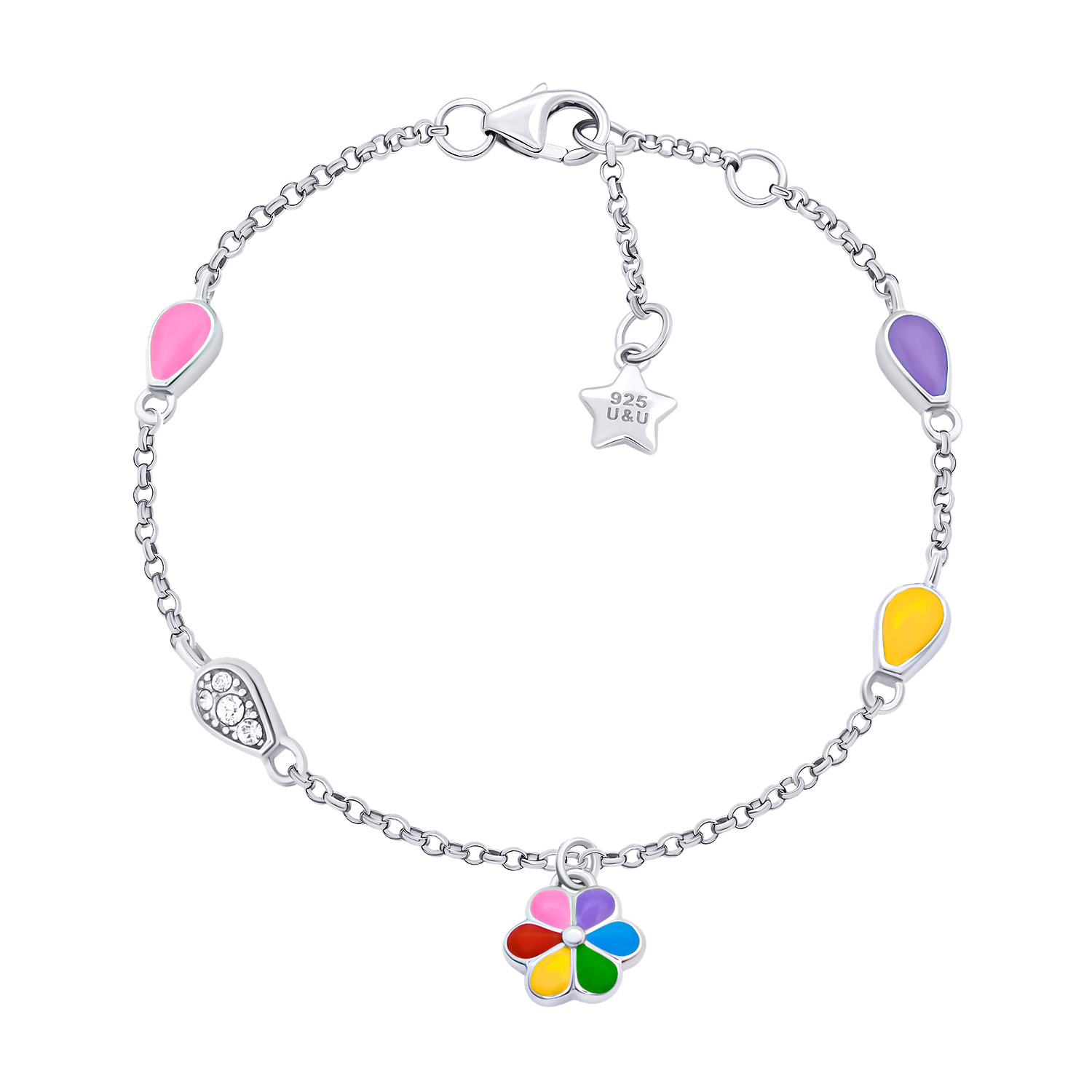 Браслет на ланцюжку UmaUmi Flowers Ромашка кольорова з різнобарвною емаллю та фіанітами - яскравий дитячий браслет з регулюванням розміру, який подарує настрій і нагадає про вашу любов! Браслет на ланцюжку Ромашка кольорова з різнобарвною емаллю та фіанітами з колекції UmaUmi Flowers прикрасить руку дитини на будь-якому заході та гармонійно доповнить будь-який образ. Браслети адаптовані спеціально для дітей: без гострих мілких деталей, легкі та комфортні. Ювелірний шнурок та ланцюжок надійно фіксують виріб на руці і запобігають його втраті, а також дозволяють регулювати розмір – "ростуть" разом із вашою зірочкою. Рекомендовано для дітей від 3-х років.